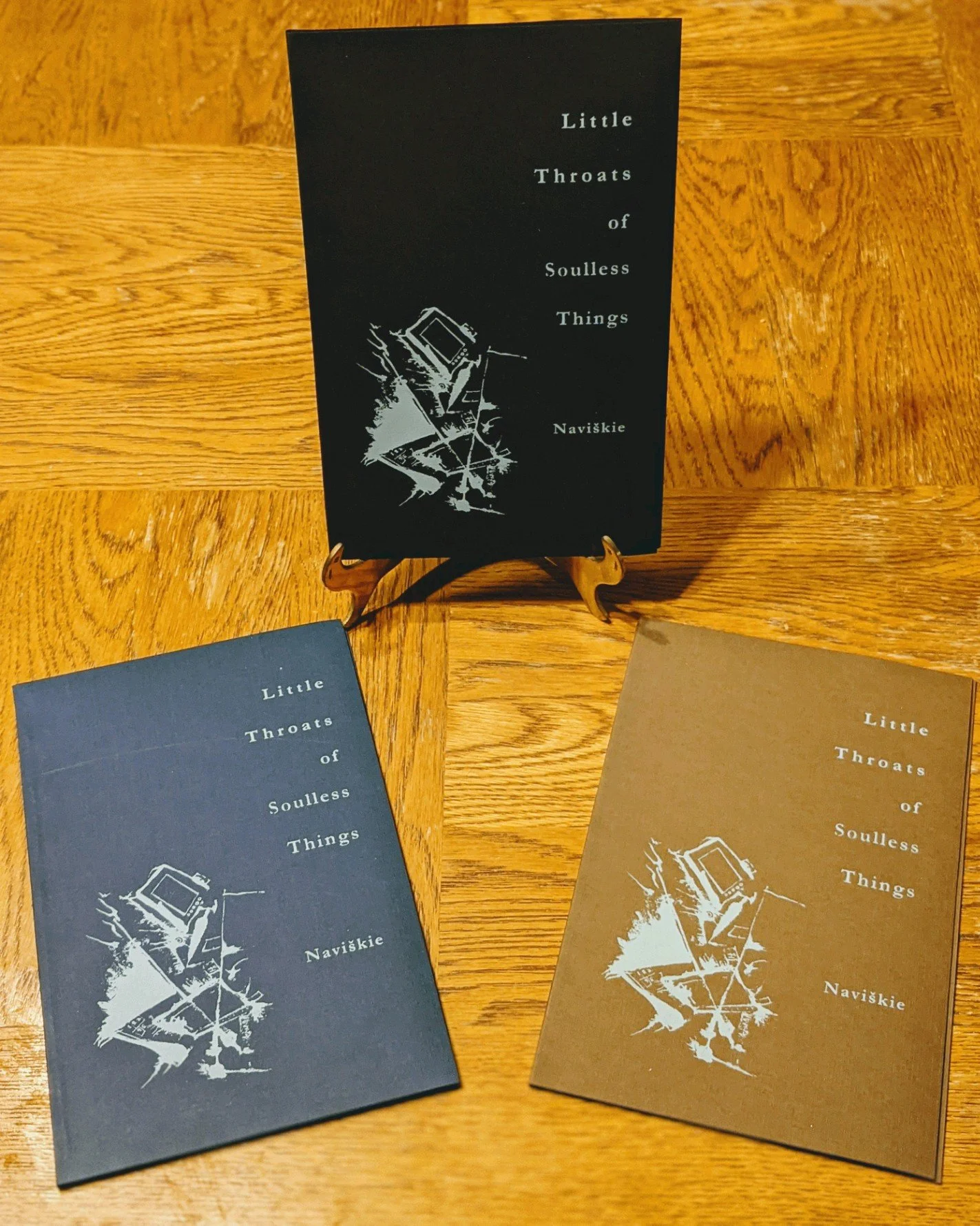This multimedia poetry chapbook includes poetry by Tm Novak with ink drawings by Dave Gonzalez. The bookbinding and screen printing were handmade by Renate Mairie. The accompanying sound art tracks (recorded under Novak’s moniker Naviškie) can be downloaded/streamed for free through Bandcamp.